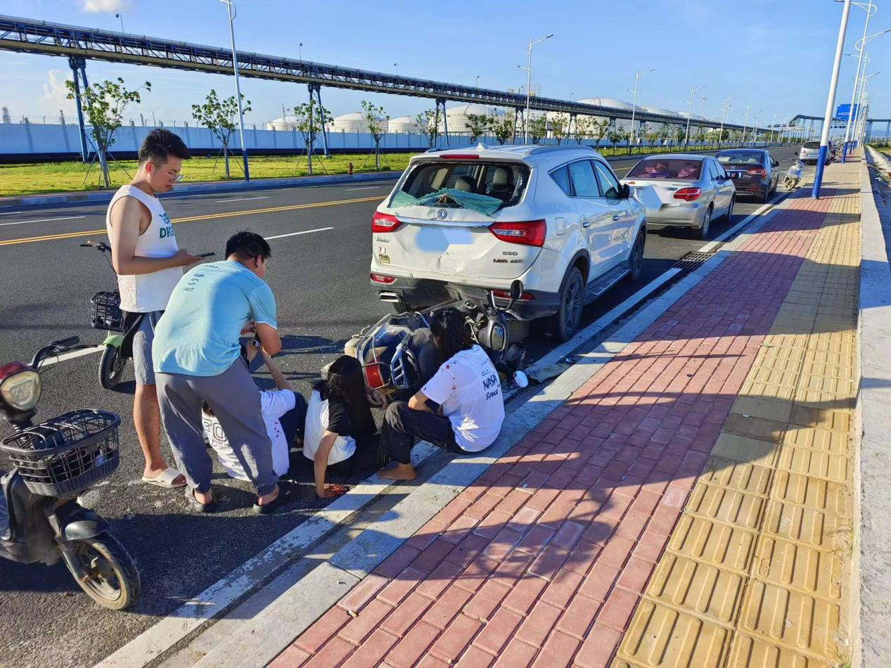 近日,在大南海石化工业区环海南路发生一起交通事故,两位年轻人的暖心行为引起了广泛关注。据了解,7月24日下午15时许,一辆电动摩托车撞上了停放在路边的小汽车,三位女孩受伤,其中,两名女孩伤势严重,躺在地上无法动弹。就在这时,两位年轻人跑了过来,向其中一位伤势较轻的女孩了解具体情况,对另外两位女孩子进行安抚陪伴,并联系小汽车车主。此时,另一位好心市民也跑过来帮忙,拨打了110和120。两位年轻人一直陪伴在三位女孩身边,直至救护车将她们送到医院治疗才离去。