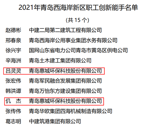 近日,青岛西海岸新区总工会发布通知,公布“2021年度青岛西海岸新区创新型班组、职工创新能手、职工创新成果”评选情况,公司工程技术研究中心荣获新区创新型班组殊荣,该部门副主任吕灵灵、副主任工程师仉杰当选新区职工创新能手。