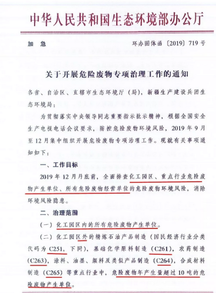 日前生态环境部印发加急文件《关于开展危险废物专项治理工作的通知》。