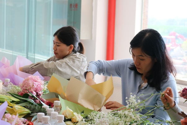 在由玫瑰花、洋桔梗、绣球花、百合、满天星之香气调和而成的阵阵馨香中,花艺师向女职工们讲解插花知识,介绍花材的名称、养护方案、花材的处理和修剪方法,示范插花步骤,女职工们聚精会神地学习后认真设计自己的花篮,相互讨论,时不时迸发出爽朗的笑声,经过精心设计,一个个形态饱满、充满生命力的花篮就诞生了,大家纷纷拿出手机,记录下这美好的时刻。
